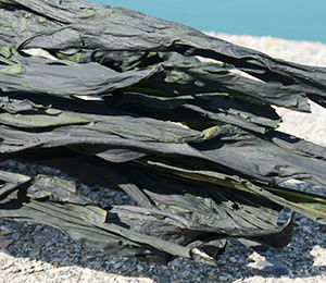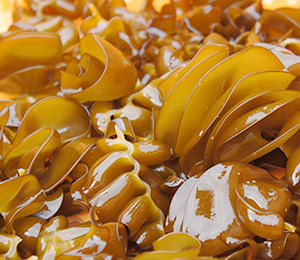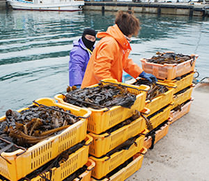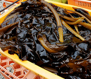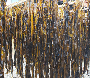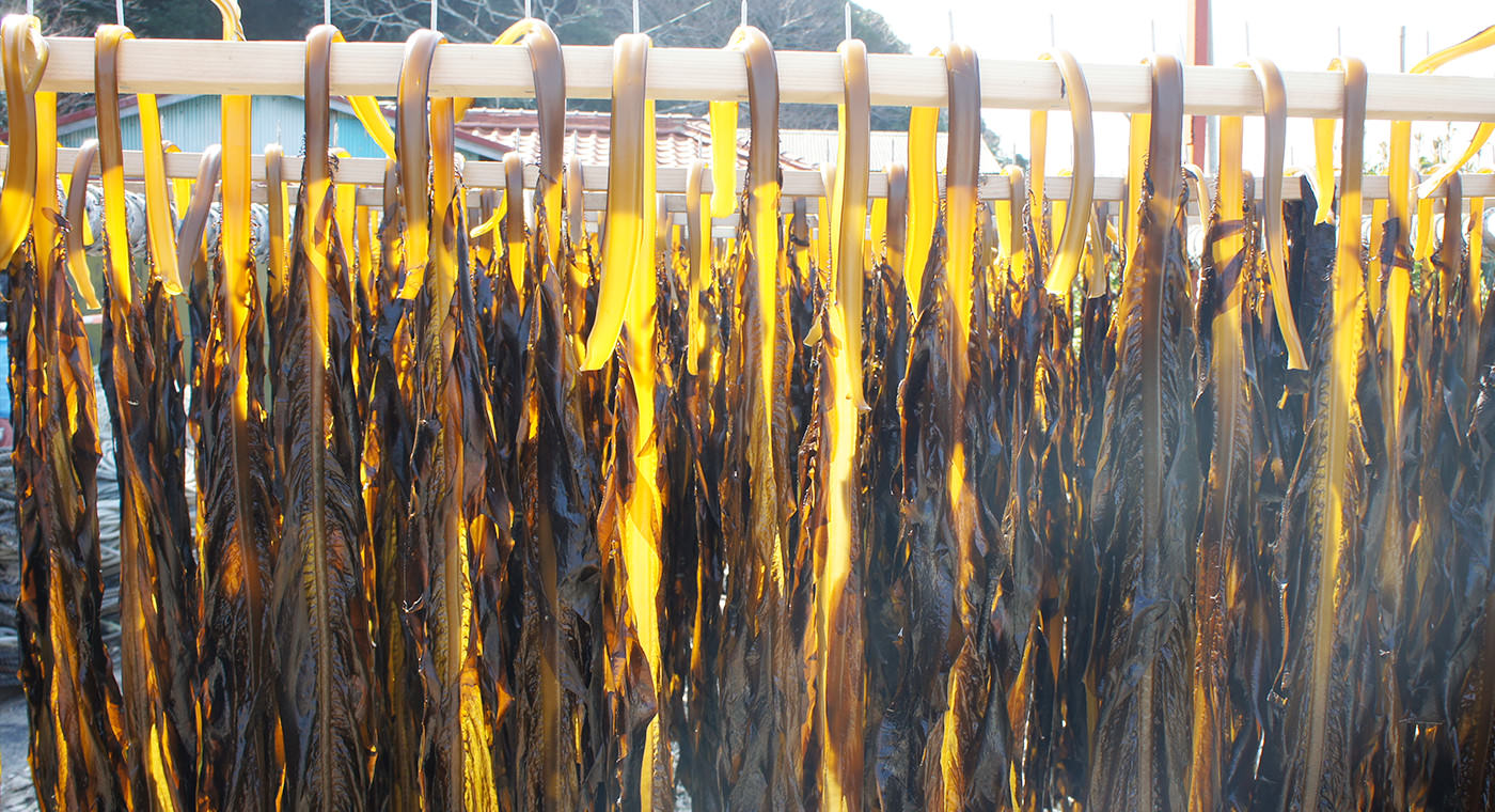 豊富な栄養分を貯えた伊勢湾で育つワカメ。 秋に種付けしてから収穫するまで、何度もワカメを間引き栄養価の高いワカメに育てます。 2月から4月が収穫時期。沖で収穫したワカメのメカブを一つずつ丁寧に取り、潮風が吹く海沿いで天日干しにします。 ワカメの形状は一株一株が違い、葉、茎の厚みや裂くのに要する力も異なるため機械化が難しく今でも手作業で行っています。