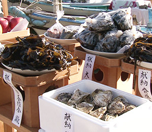 1月3日早朝、山から切り出した椎の木を泊の浜に御棚をしつらえ、蛸、ワラさ、餅、神酒、そして「コシキ島」に奉納するための初物のミカンを俵に詰め飾ります。龍神に対しお供えをするこの神棚飾りは「オヤマカザリ」と呼ばれます。