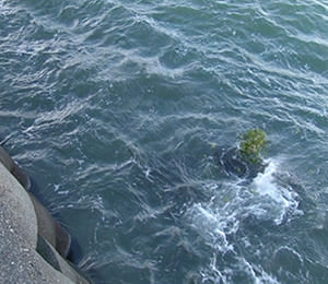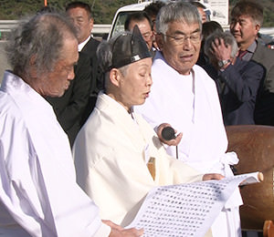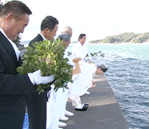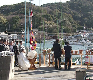 御棚祭文を読み上げ、玉串を奉納した後、龍神の依代「コシキ島」への初物のお供えとして、西の浜で石のおもりを入れた俵を海へ投げ入れます。これにより1年の豊漁と安全を祈願します。
