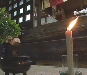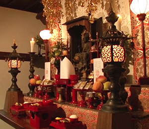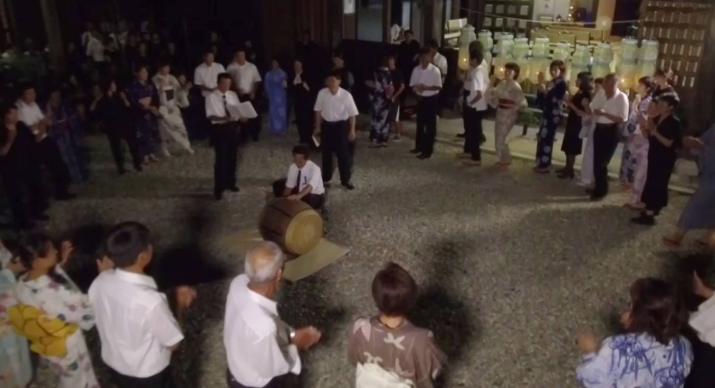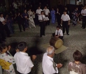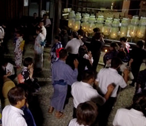 8月24日夜、桃源寺で執り行われる法会。 初盆の家から切子提灯を持ち寄りお勤めが行われます。 お勤め後は、境内で初盆の親族のみで、音頭出しの歌に合わせ盆踊りを行います。 盆踊りは、お盆に帰ってきた祖先の霊たちを迎え送るための念仏踊りであるといわれ、宗教行事の一環 として行っています。 盆踊りが終わると切子提灯を燃やし精霊送りを行ないます。